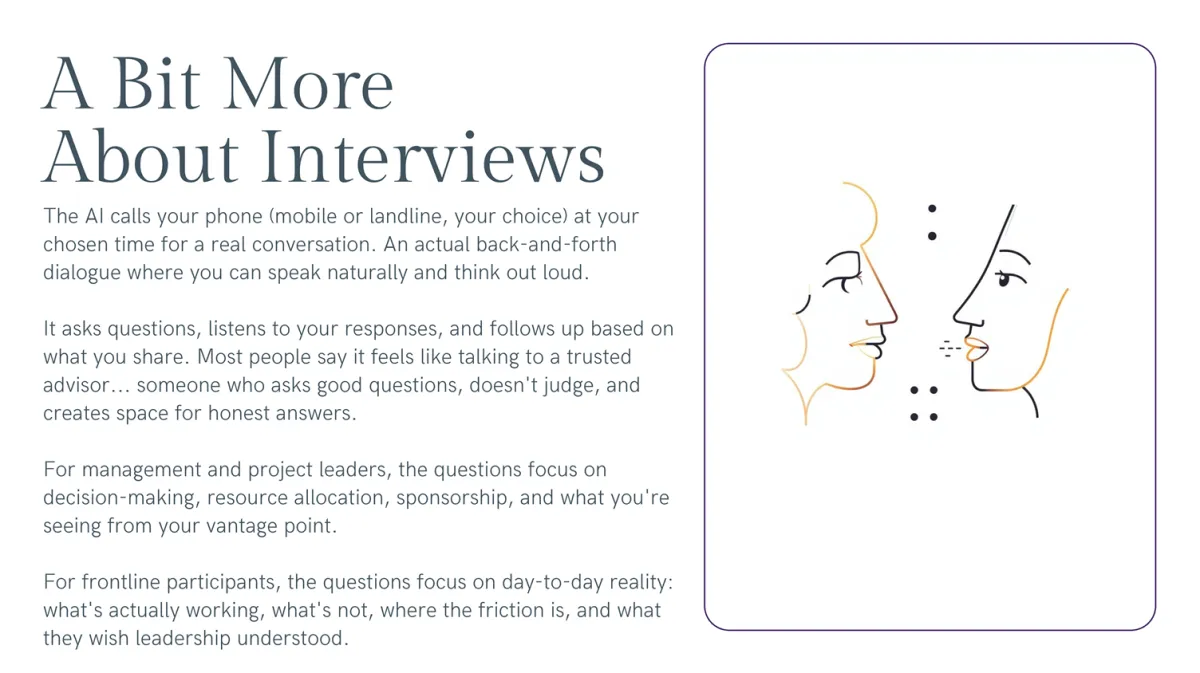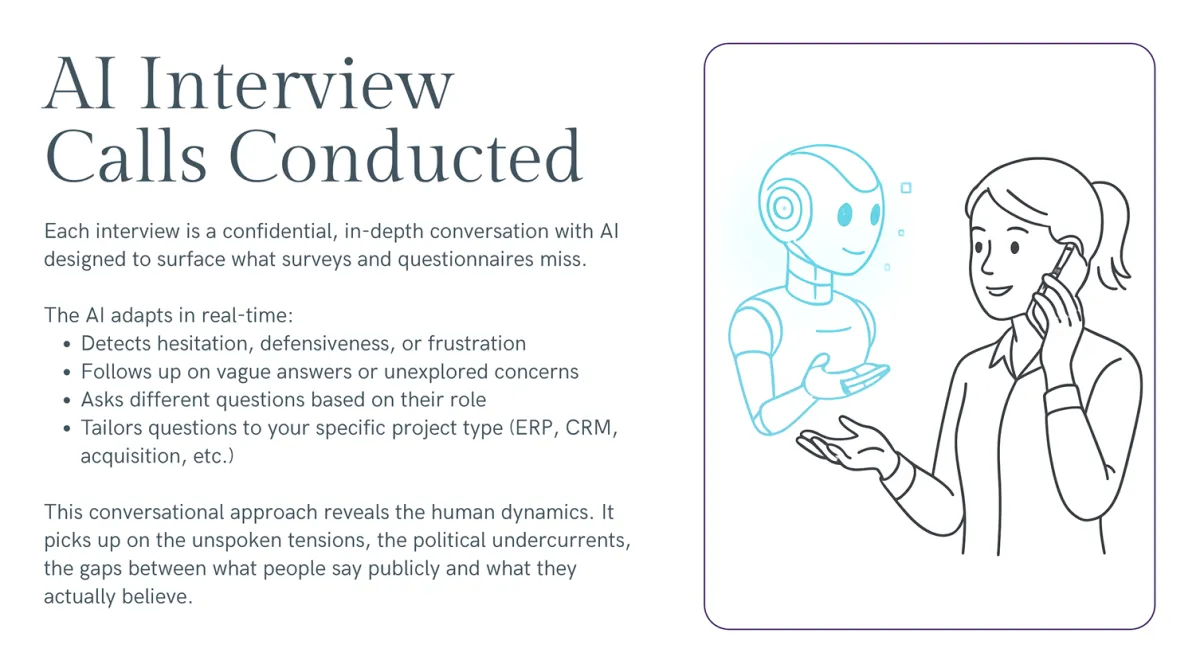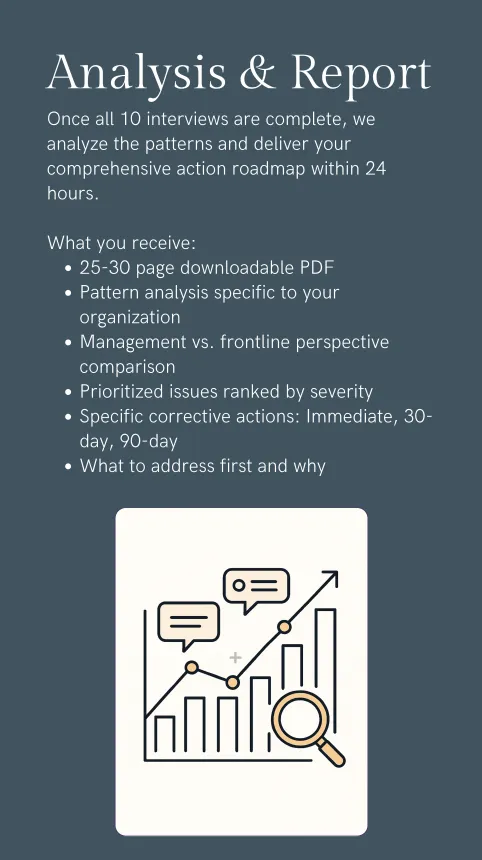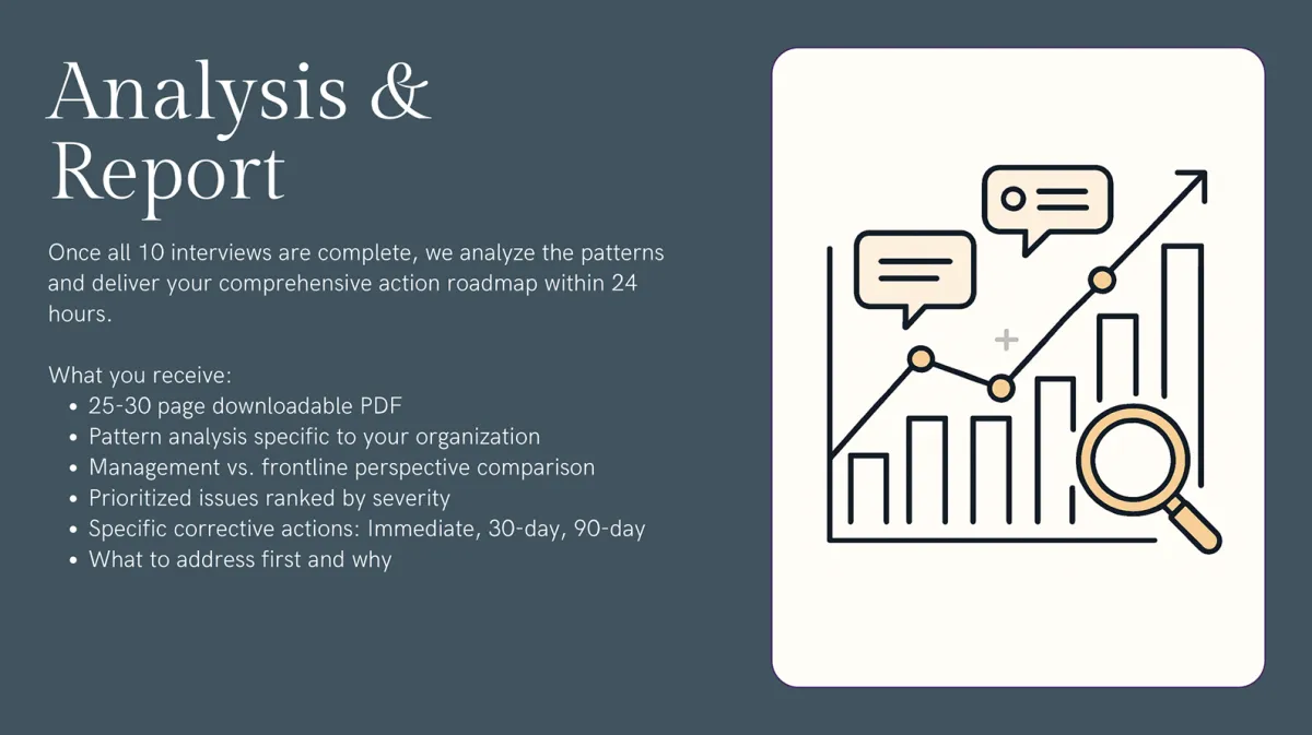 Your report will be specific to YOUR project, YOUR organization, YOUR patterns. These examples show the depth and actionability you'll receive, but the findings and recommendations will be tailored to what we discover in your interviews.